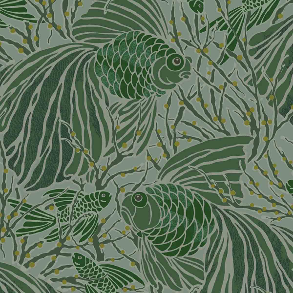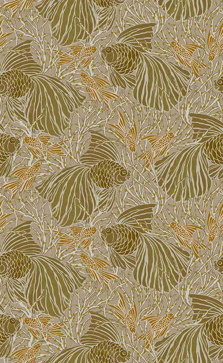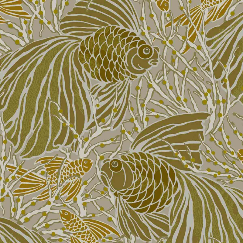 The Cyprins wallpaper displays an aquatic decor populated by stylized fish with outstretched fins. Free and rhythmic, they undulate between algae with graphic branches. The drawing composes a vibrant scene with chiseled contours, like a living fresco on the walls. Inspired by a historical gouache, this wallpaper by Isidore Leroy evokes a suspended and peaceful world.