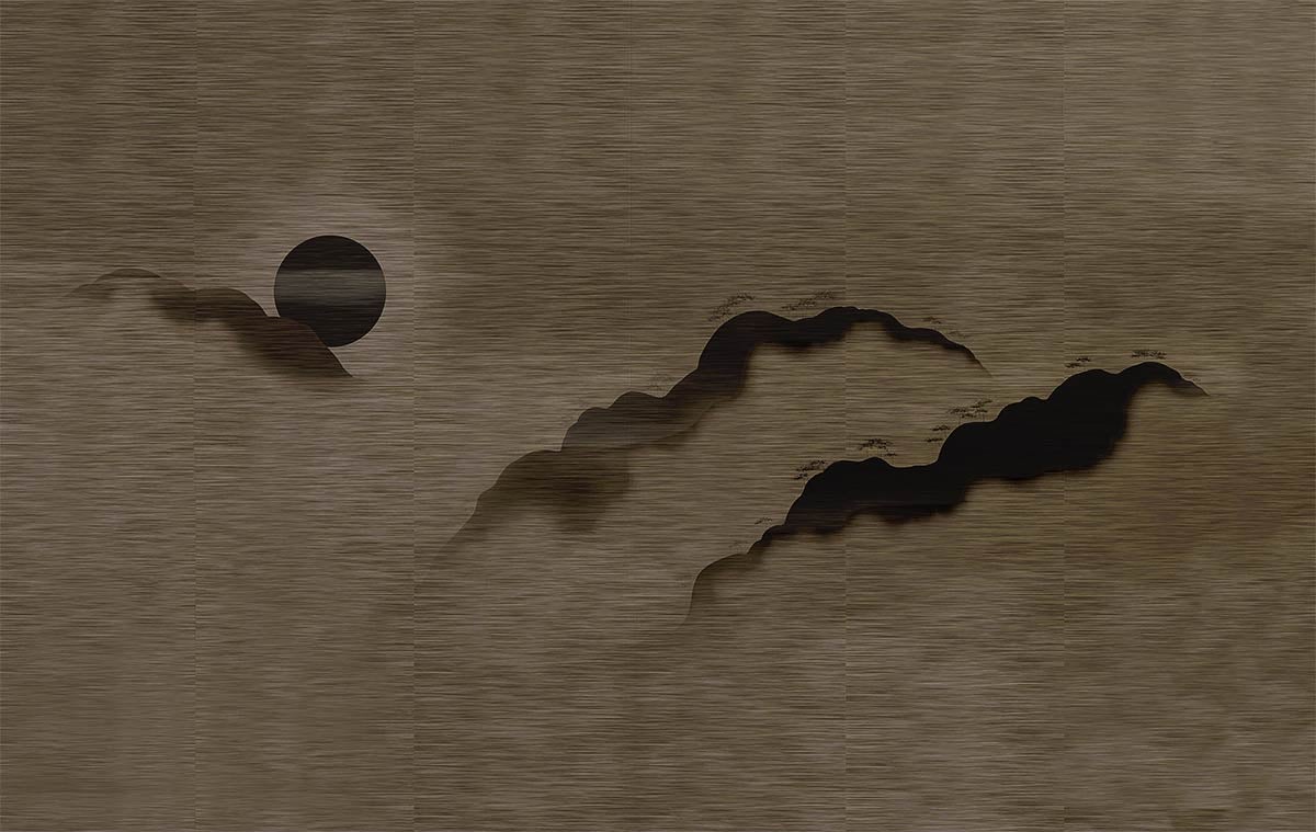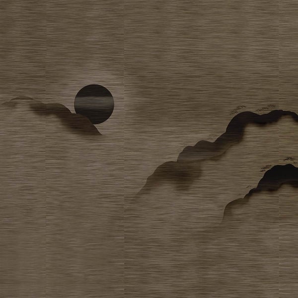 The panoramic wallpaper Shogun reveals a contemplative scene where fine lines draw misty mountains. A solar eclipse rises, circled by metallic reflections, above silent peaks. The pattern, made from natural fibers, plays on contrasts and transparencies. Signed K3 Design by Kenzo Takada, every detail testifies to the richness of a careful work.