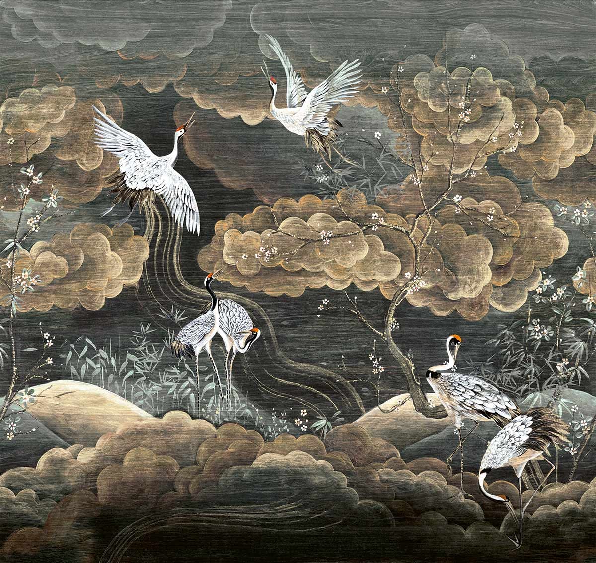 The Byobu wallpaper by Masureel features a graphic pattern inspired by Japan. In a vast panorama, cranes and swirls float among the branches and clouds in a poetic balance. This structured wall decoration captures an atmosphere of moving nature and seduces with its delicate rendering. The whole evokes art and travel with a singular visual depth.