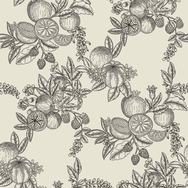 Gerty is a wallpaper with a fruity botanical motif that evokes the illustrated boards of ancient herbariums. Split pomegranates, stylized citrus fruits and clusters of berries intertwine with light foliage, drawn with precision. Each line seems to be drawn in ink and recalls the finesse of the prints of yesteryear. A Street offers this plant abundance in a composition that is both dense and fluid.