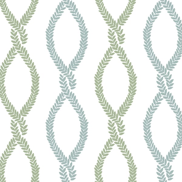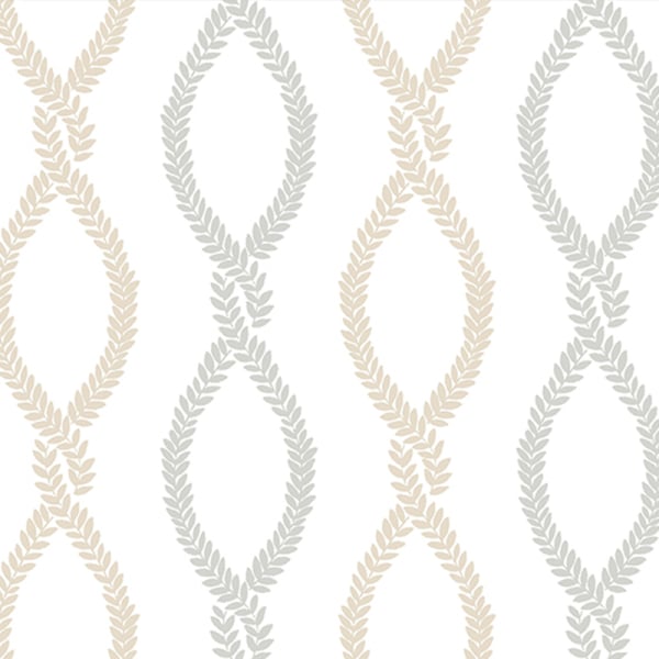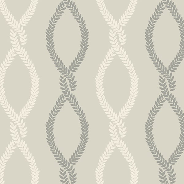 The Laureate wallpaper reveals a plant motif drawn with finesse. Garlands of vines, formed of small symmetrical leaves, intertwine vertically to compose a network of elongated diamonds. This regularity gives the illusion of a braided interlace, whose fluid rhythm accompanies the height of the walls. York Wallcoverings infuses this ornamental composition with a gentle graphic charm.