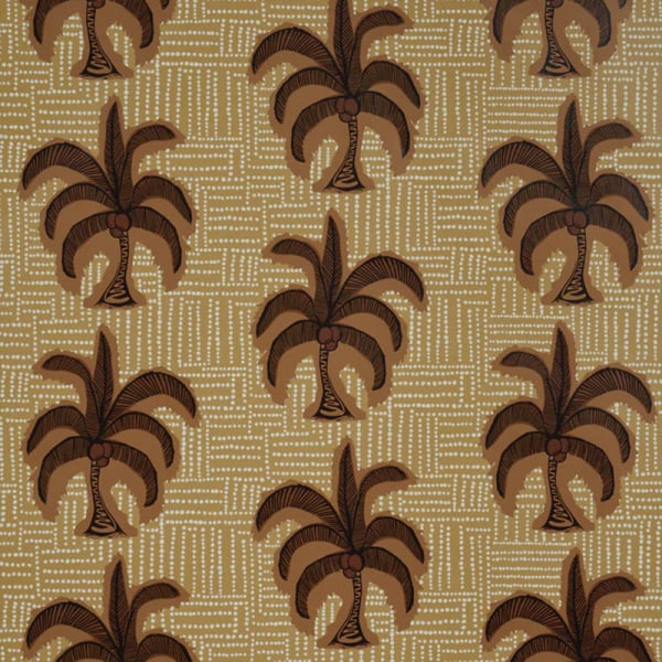 The Agua De Coco wallpaper features graceful coconut trees, standing on a vibrant frame punctuated by irregular dots. The design evokes a tropical atmosphere, animated by the calm movement of the foliage. The whole is inspired by the contrasting landscapes of La Guajira, between arid desert and sea shores. Signed Schumacher, this structured pattern evokes a graphic vision of a distant coastline.