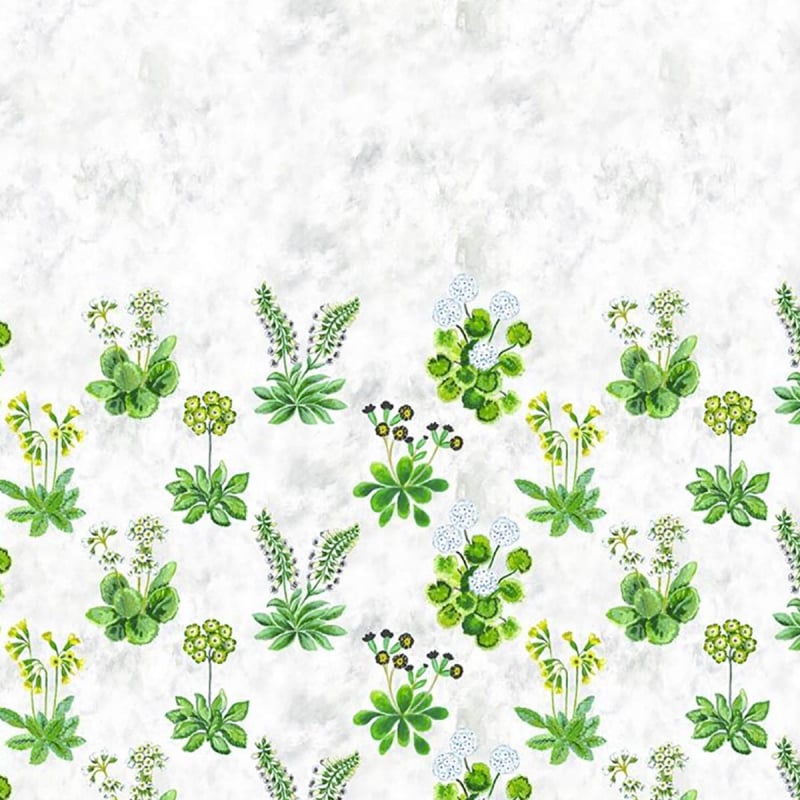 Primevère by Designers Guild is a panoramic wallpaper with a delicate floral pattern. Bouquets of primroses and auricles unfold in a frieze in the lower part, then fall off with regularity. The precise design evokes an orderly botanical herbarium. Each composition stands out against a patinated, subtly cloudy background that creates a hushed depth.