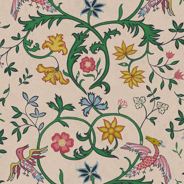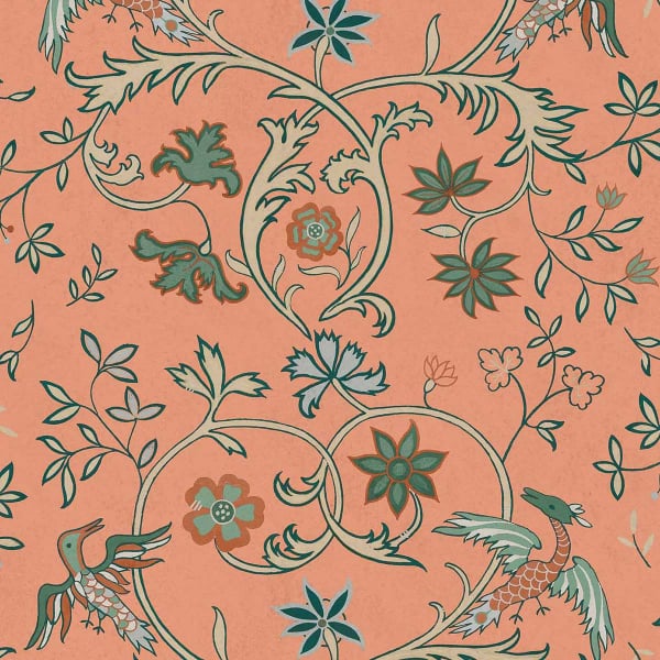 The Antwerp Damask wallpaper from Coordonné features a floral pattern inspired by historic damask fabrics. Large, undulating scrolls form a vegetal architecture within which delicate corollas, palmettes, and finely cut foliage blossom, punctuated by birds with outstretched wings. The whole reveals a masterful harmony, brought to life by interwoven arabesques that give the composition a fluid rhythm.