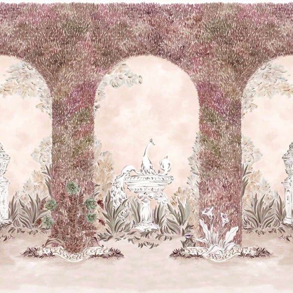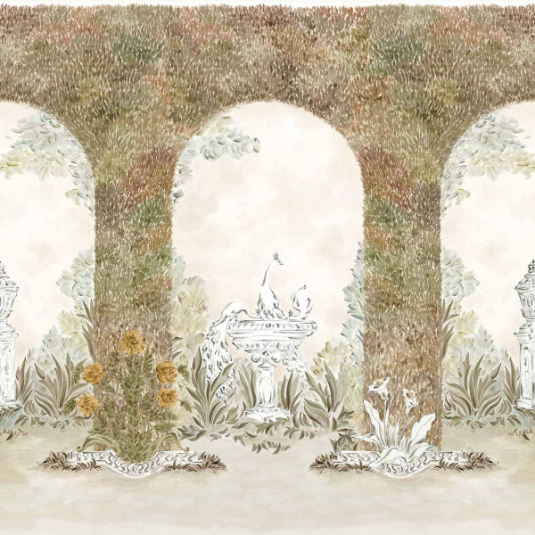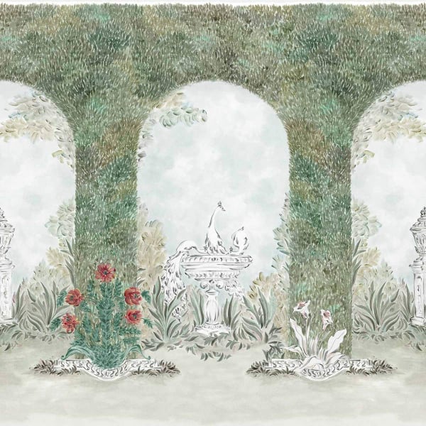 Coordonné presents the Alcazar panoramic wallpaper, an architectural composition in which plant-lined arcades structure the scene. Beneath these vaults of dense foliage, one finds ornamental structures, carved basins, and slender urns, all nestled amidst freely sketched flora. The pattern conjures up a classically inspired garden, enlivened by a central fountain where birds are perched.