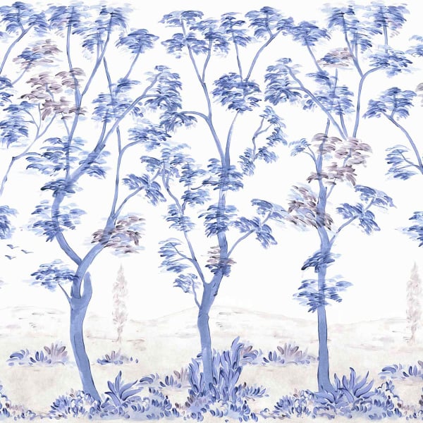Coordonné’s panoramic Cartuja wallpaper depicts a wooded landscape with flowing lines, where tall, slender trunks rise gracefully in an airy composition. The design, rendered in a painterly style, depicts ethereal foliage that seems to gently vibrate in space. In the foreground, stylized undergrowth spreads its foliage, while in the background, indistinct contours and a few birds in flight can be made out.