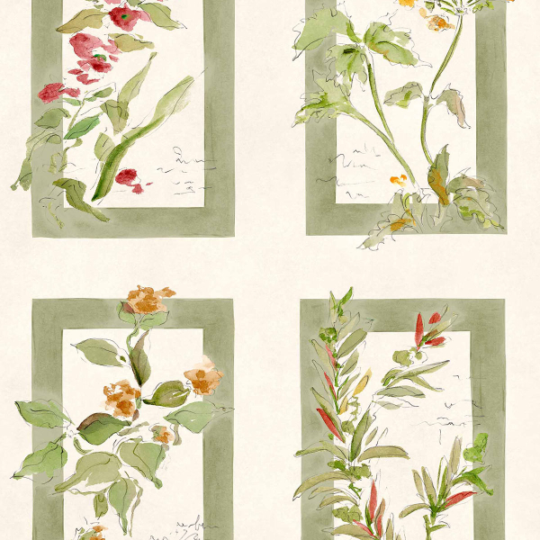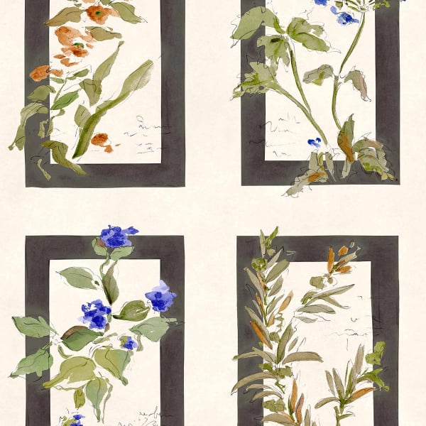 Sta Cruz de Coordonné is a wallpaper featuring a floral composition inspired by botanical plates. Four frames structure the surface, each revealing a slender stem, supple leaves, and delicately sketched corollas, as if drawn in watercolor. The design combines free-form contours and nuanced wash effects, revealing the texture of the paper and the spontaneity of the artist’s touch. The whole design evokes a poetic herbarium, where the vegetation seems to float in a luminous calm.