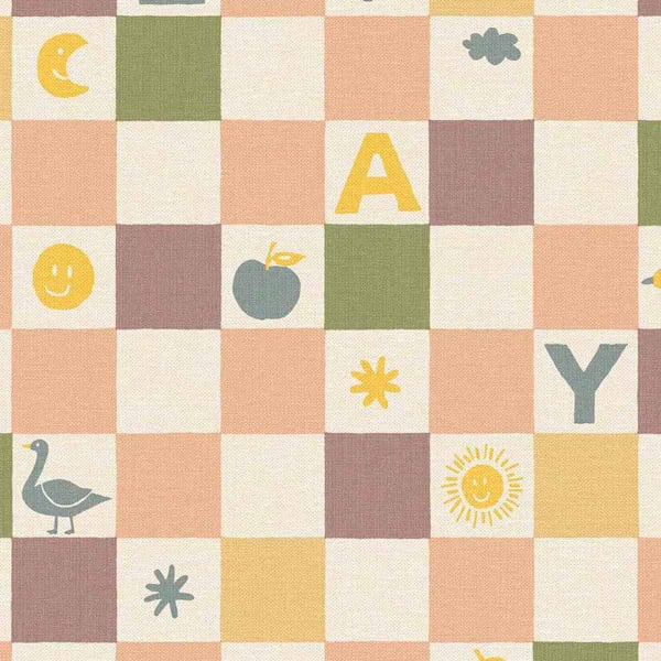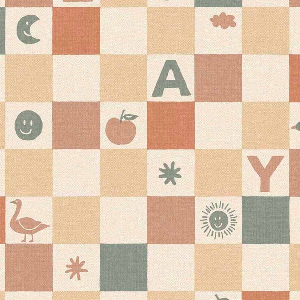 Eijffinger's Play wallpaper features a geometric pattern arranged in regular squares. Each square features letters, symbols, and small, stylized drawings that punctuate the surface with a lively graphic rhythm. The overall effect is that of a playful checkerboard, where typography and figures interact with precision. This wall covering exudes a clean, rhythmic decorative style.