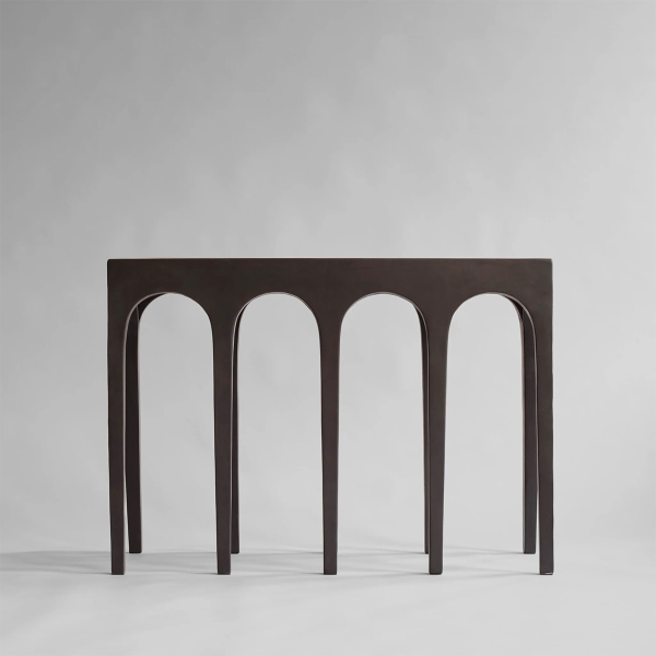 Con su silueta majestuosa, la consola Bow Big impone su presencia mediante una serie de arcos regulares y esbeltos. Esta pieza monolítica presenta un motivo escultórico sobrio y rítmico que evoca los pórticos clásicos. Diseñada por 101 Copenhagen, es el resultado de un moldeado en fibra de hormigón. El conjunto expresa un rigor a la vez formal y refinado.