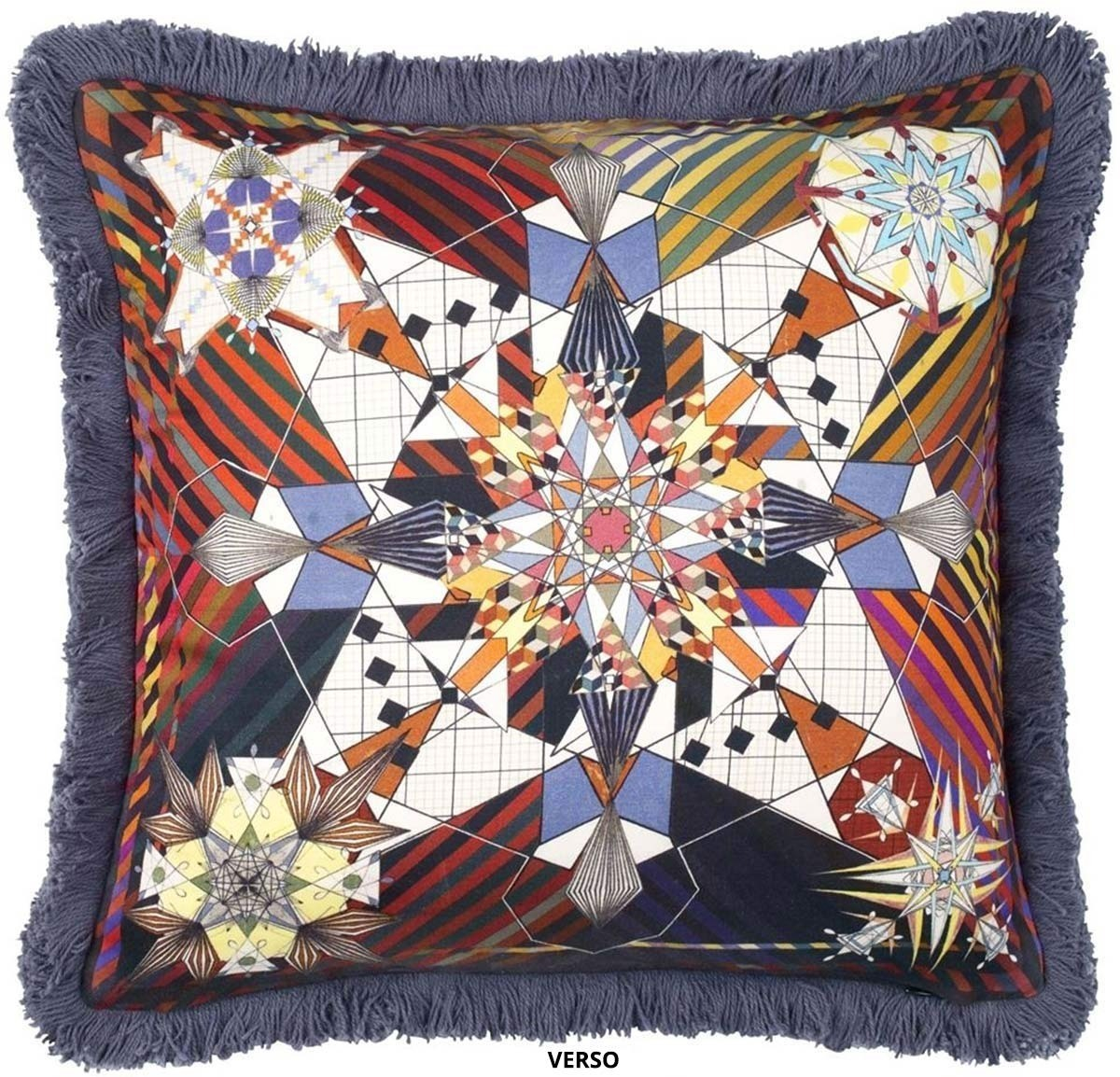 Propuesto por Christian Lacroix, el cojín de raso de algodón Do You Speak Lacroix? presenta un diseño rico en colores brillantes. El diseño frontal presenta letras estampadas sobre un fondo oscuro. Estos últimos están decorados con adornos bordados. La parte posterior del accesorio luce un gran rosetón que evoca un diseño caleidoscópico. El conjunto se completa con flecos de algodón.