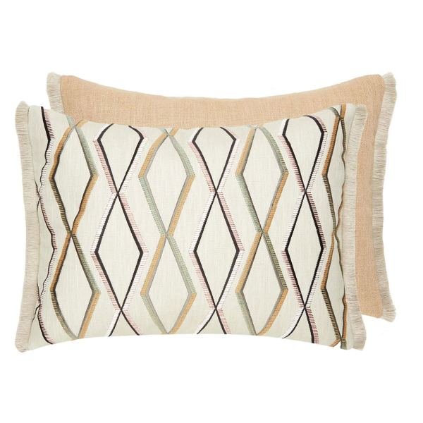 Designers Guild propone Trevenna, un cojín rectangular de lino. En su parte delantera, una sucesión de líneas y rombos bordados componen un motivo geométrico. En contraste, su parte posterior lisa resalta la textura densa y la sobriedad de la fibra. Con flecos de musgo en ambos lados, esta pieza subraya el diálogo entre el rigor gráfico y la suavidad textil.