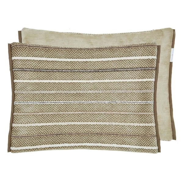 El cojín rectangular Porthminster presenta un motivo geométrico en la parte delantera. Las líneas horizontales regulares recorren una base de chevrones discretos, creados por un tejido jacquard preciso. A través de su composición de terciopelo liso, el reverso de este modelo Designers Guild forma un contraste de textura. El conjunto está bordeado en dos lados por un ribete fino.