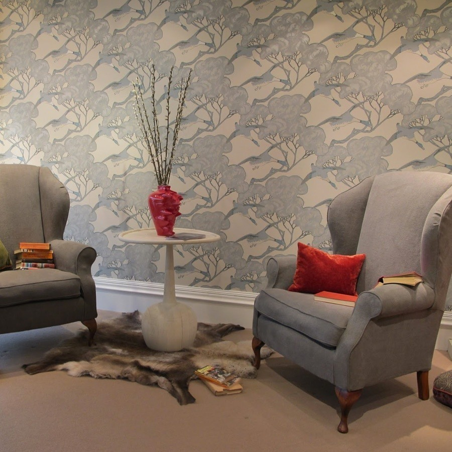 Un impresionante patrón de patos volando entre pinos adorna este revestimiento de paredes de alta gama . Este diseño de inspiración Art Nouveau es sin duda el mayor éxito de la marca.