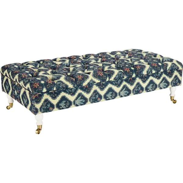 Creado por Mindthegap, Phoenicia Batik Fabric es un asiento rectangular acolchado con un estampado floral. Los rombos albergan elementos vegetales compuestos por ramas finas y pequeñas flores. El lino natural subraya el carácter auténtico y atemporal del diseño. Las patas de madera, rematadas con ruedas doradas, añaden un toque funcional al aspecto clásico del conjunto.