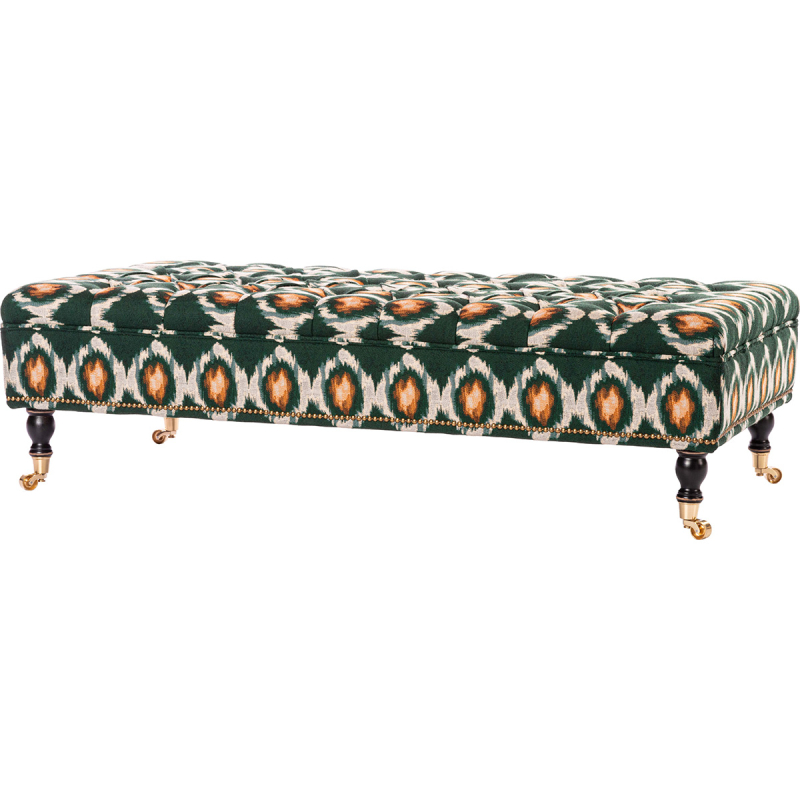 Pradesh Ikat Woven Fabric es un asiento con un estampado geométrico de contornos vibrantes. Firmado por Mindthegap, se apoya sobre patas de madera con ruedas doradas y remaches. La tapicería regular, adornada con detalles abotonados, acentúa la presencia gráfica del algodón. Cada elemento prolonga la intensidad rítmica del modelo.
