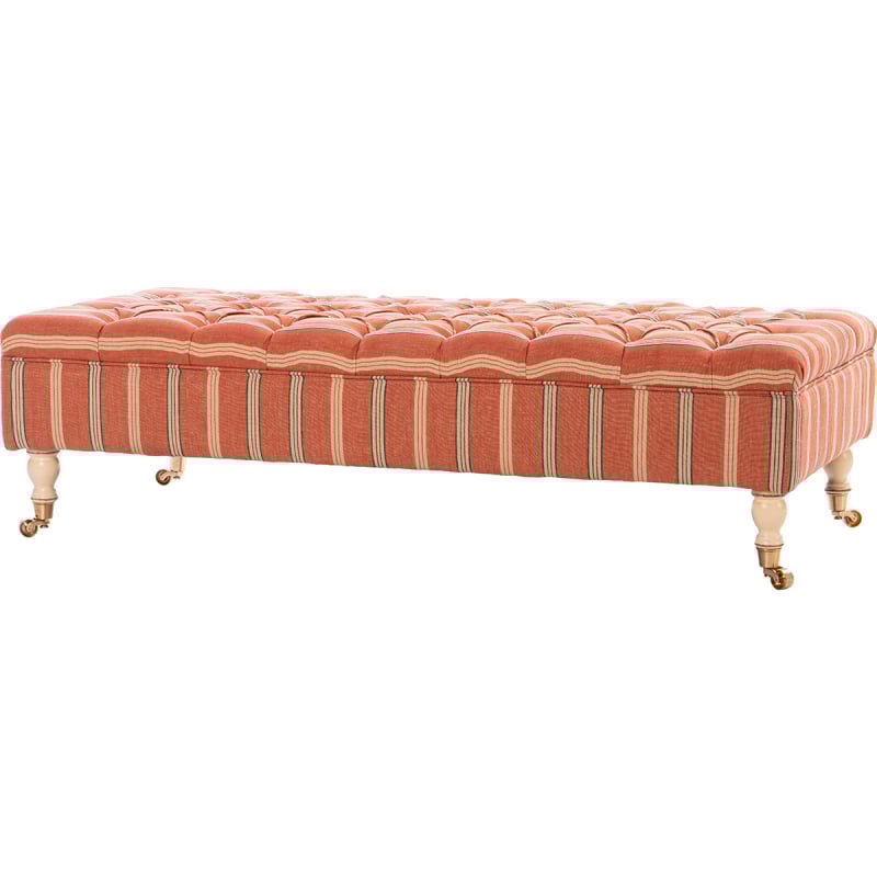 Un estampado a rayas clásico, tejido sobre un lienzo de lino, se muestra en el asiento Oregon Stripes Linen. Las líneas, a veces finas, a veces más anchas, crean un ritmo discreto, subrayado por un acolchado profundo. El conjunto se apoya sobre patas de madera, con ruedas doradas y remaches. Este banco otomano de Mindthegap presenta una estética atemporal.