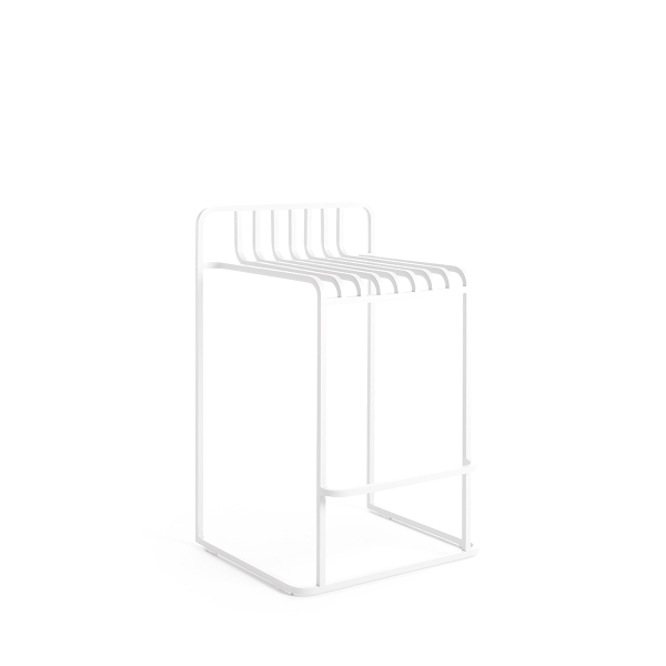 La silla alta Grill es una silla con un diseño gráfico inspirado en las barras metálicas. Cada varilla de aluminio dibuja un ritmo visual regular y crea una silueta de gran ligereza. Diseñado para exteriores por Diabla, este modelo se apoya sobre una estructura resistente. Afirma una presencia escultórica clara y expresa un equilibrio controlado entre rigor y estética.