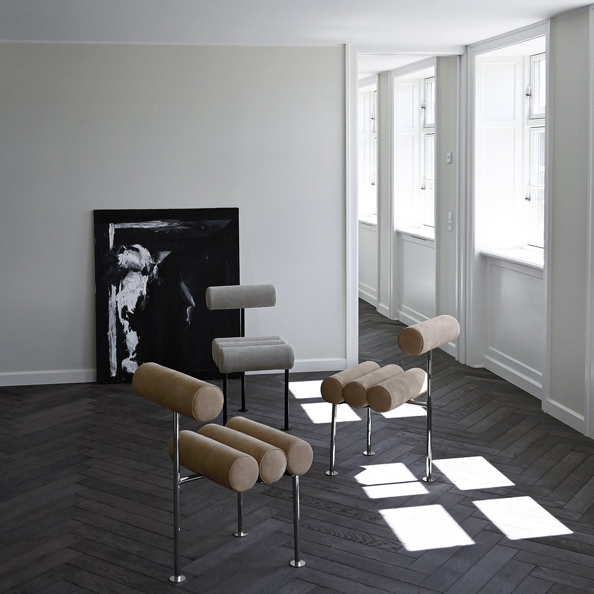La silla Hiro Nubuck explora los ritmos geométricos con contornos redondeados. Los cilindros alineados componen un aspecto escultórico donde cada volumen parece flotar con precisión. El rigor de la estructura tubular contrasta con la suavidad natural del cuero nobuk. Firmado por 101 Copenhagen, este modelo de base asimétrica revela una estética equilibrada entre ligereza visual y densidad material.