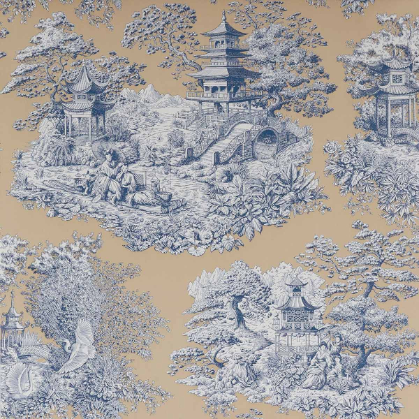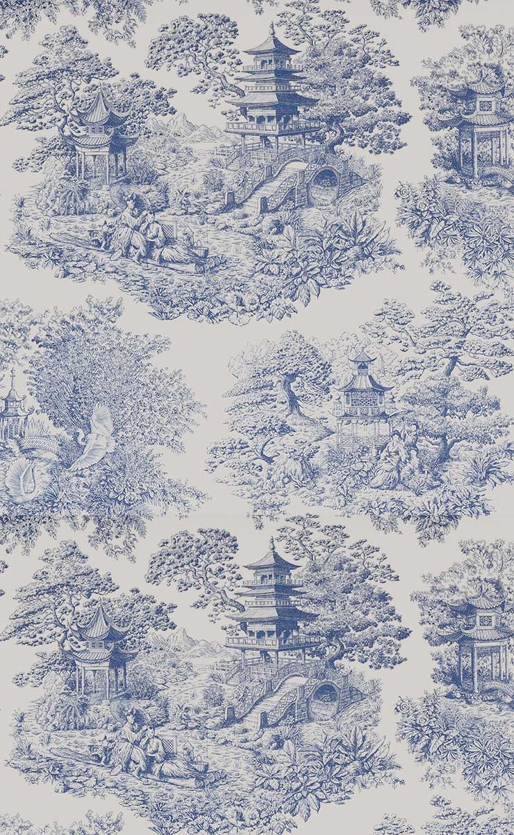 Pagodas inspiradas en la arquitectura japonesa conforman el patrón del papel pintado Nara de Manuel Canovas. Como una toile de Jouy. Este diseño oriental dibujado a mano presenta finos detalles y líneas que aportan un toque de realismo al conjunto. Algunas grúas en pleno vuelo. árboles con exuberante follaje y figuras completan estas escenas asiáticas.