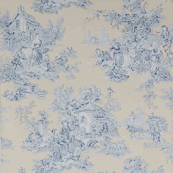 Inspirado en un toile de Jouy del siglo XVIII. El diseño del papel pintado Campagne resalta escenas de la vida campesina al final del verano. incluyendo la cosecha. Algunos animales y personajes aportan un toque de autenticidad al conjunto. Dibujado con finos detalles. este estampado propuesto por Manuel Canovas con fondo liso está disponible en colores cálidos y fríos
