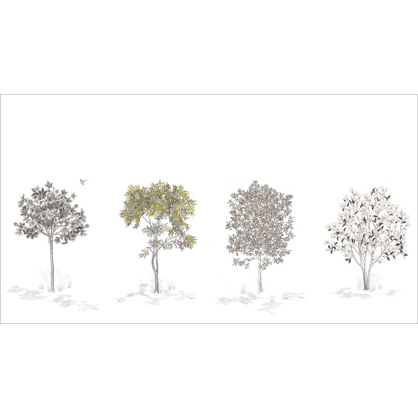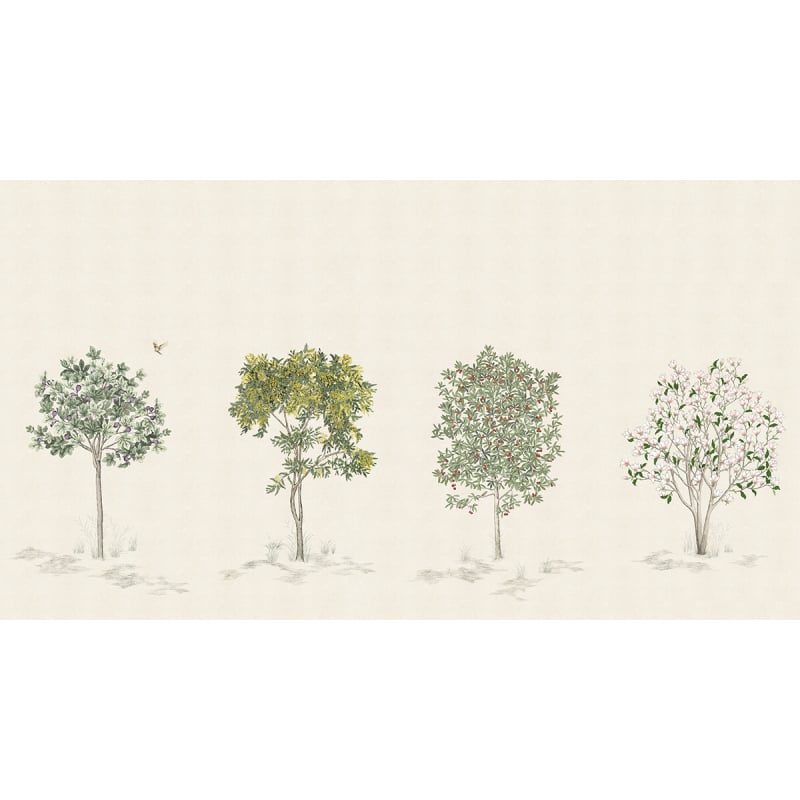 El patrón del papel pintado panorámico Natural Shrubs, dibujado con precisión al carboncillo por el artista Francesco Battista, revela tres árboles coloridos en delicados tonos sobre un fondo blanquecino. Con aspecto de grabado naturalista, revela las líneas del boceto y deja entrever una higuera, una mimosa y un madroño. Esta creación publicada por la casa Isidore Leroy insufla un toque de serenidad a los espacios que la acogen.