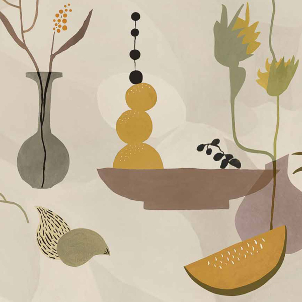 El papel pintado Centrepiece Composition de Tres Tintas despliega una sinfonía de jarrones elegantes y flores delicadas, como si estuvieran congelados en el tiempo. Esta naturaleza muerta moderna, inspirada en las artes populares, captura la belleza efímera de cada elemento. Las texturas mates invitan a la luz a acariciar la decoración y transforman el espacio en un jardín de tranquilidad.
