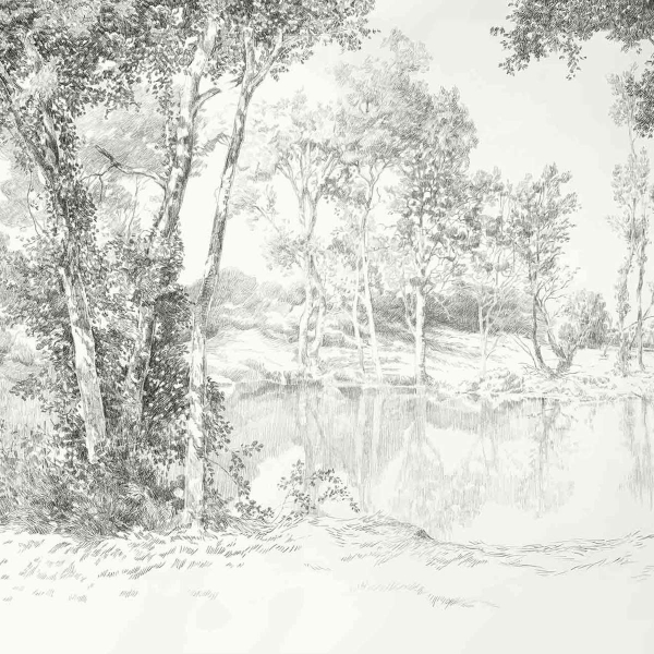 El papel pintado Promenade, un modelo panorámico de Isidore Leroy, te invita a dar un paseo por las orillas boscosas de un tranquilo lago. Los árboles parecen reflejarse en el agua dormida, con una calma absoluta que invita a soñar despierto. El paisaje, dibujado con lápiz grafito por el dúo Blundell y Thierrien, seduce con su paleta monocromática. Sumerge los interiores en una naturaleza tan misteriosa como apacible, donde el ambiente campestre adquiere una dimensión poética.