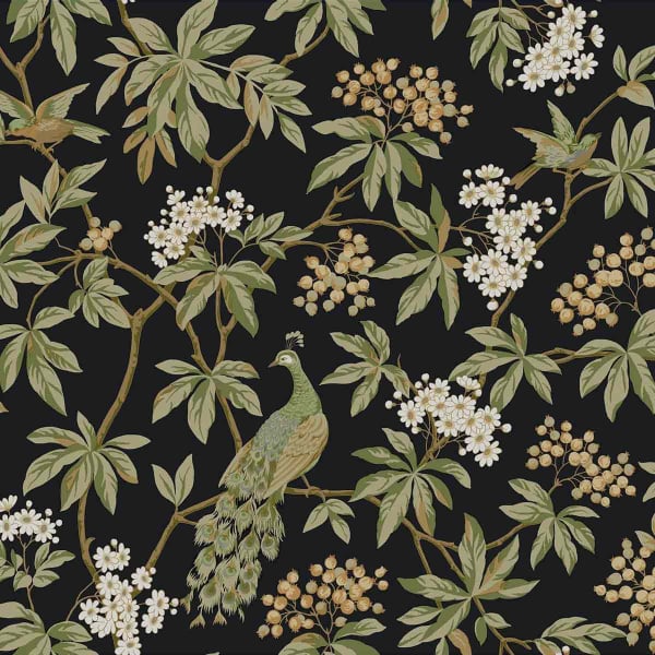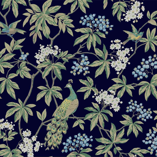 Un motivo botánico se revela en la superficie del papel pintado Peacock Estate de York Wallcoverings. Un pavo real con la cola desplegada emerge en medio de un exuberante follaje, adornado con racimos de bayas y flores abiertas. Dos gorriones con las alas extendidas animan esta composición. Estas ilustraciones evocan la tranquilidad de un jardín suspendido en el tiempo.