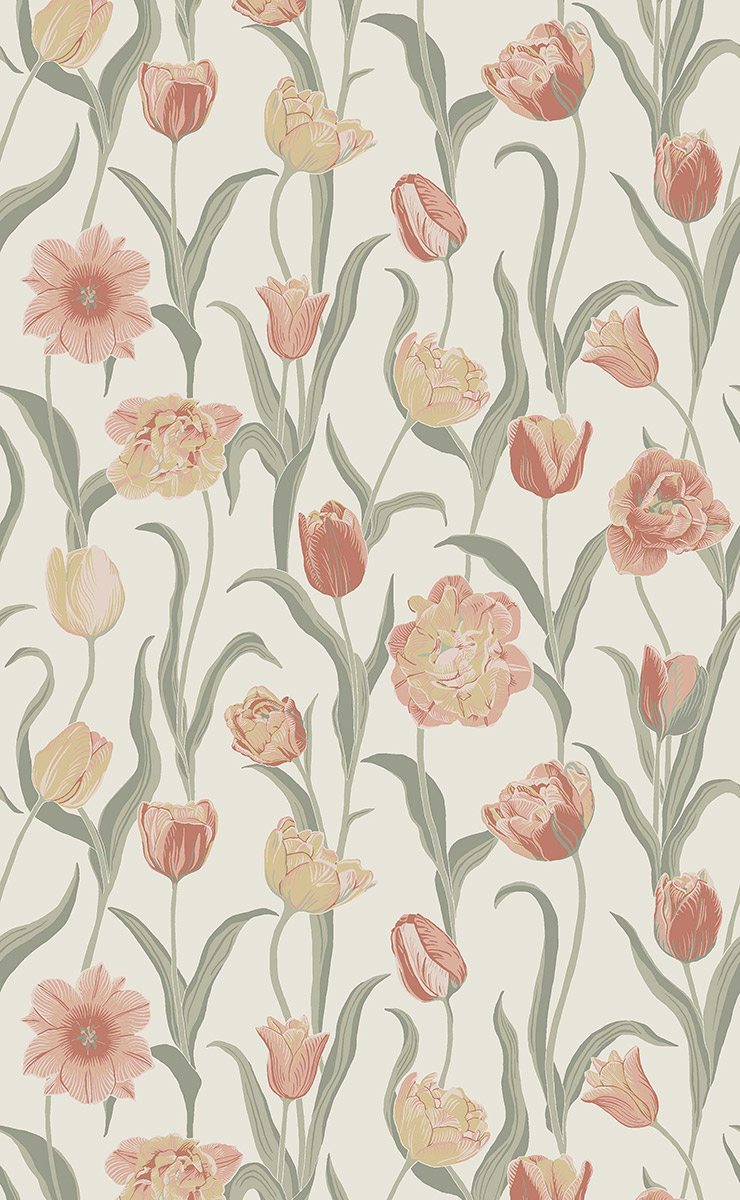 El papel pintado La Belle Époque despliega una escena floral compuesta por esbeltos tulipanes, finamente dibujados a mano. Esta composición vegetal, reproducida por Boråstapeter, evoca un jardín estilizado con un encanto poético. En un equilibrio entre ligereza y abundancia, cada tallo se eleva con suavidad, adornado con corolas abiertas o cerradas. Esta creación revela la sensibilidad del trazo y la riqueza del motivo.