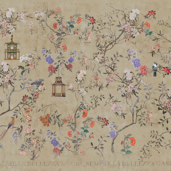 El papel pintado panorámico Oriental Gold explora una escena botánica densa y poética, inspirada en un estampado de estilo chino floral. Las ramas sinuosas recorren un fondo liso, donde florecen opulentas flores. Pájaros posados y lámparas colgantes estructuran este jardín onírico con mesura. Cada elemento contribuye a crear un ambiente con el encanto antiguo propio de Wall&decò.