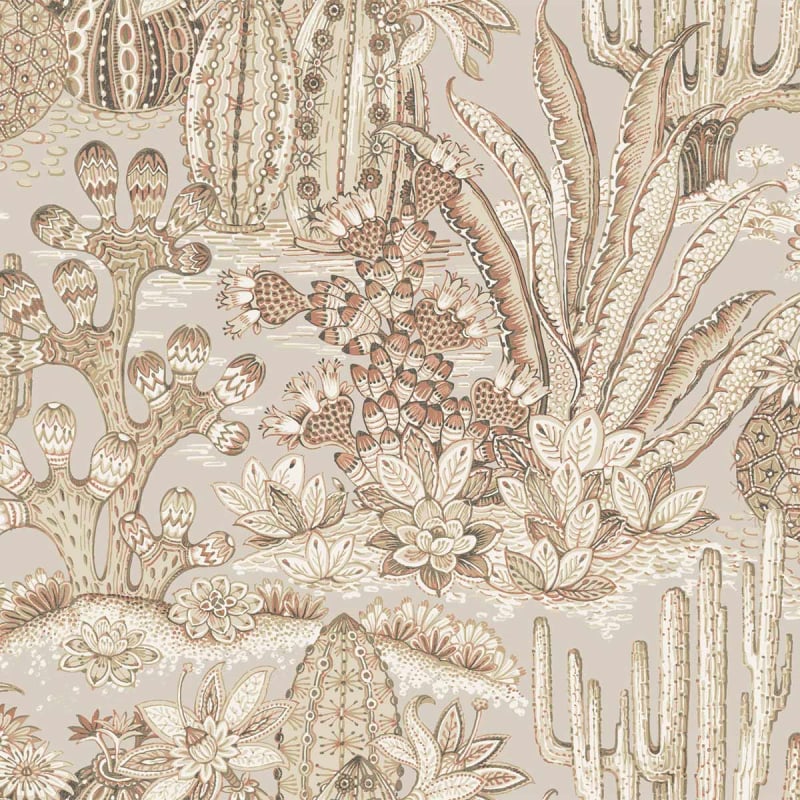 El papel pintado Lotus Land Cacti representa la impresionante belleza de la naturaleza árida. El motivo botánico revela un desierto imaginario poblado de cactus, aloes y plantas suculentas de contornos nítidos. La composición densa y repetida establece un ritmo vegetal estructurado, apoyado por texturas controladas. La impresión en Surface Print aplicada por York Wallcoverings añade un ligero relieve que resalta los detalles.