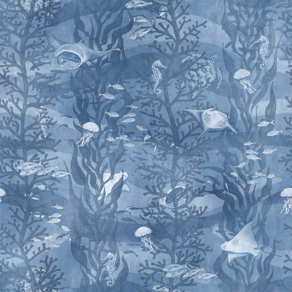Editado por Inkiostro Bianco, Kelp es un papel pintado panorámico con motivos marinos. Rayas, medusas, tortugas y caballitos de mar se mueven entre corales y algas en una composición rítmica. El dibujo evoca un ambiente poético y misterioso inspirado en los movimientos del mar. La impresión digital reproduce cada detalle con gran precisión.