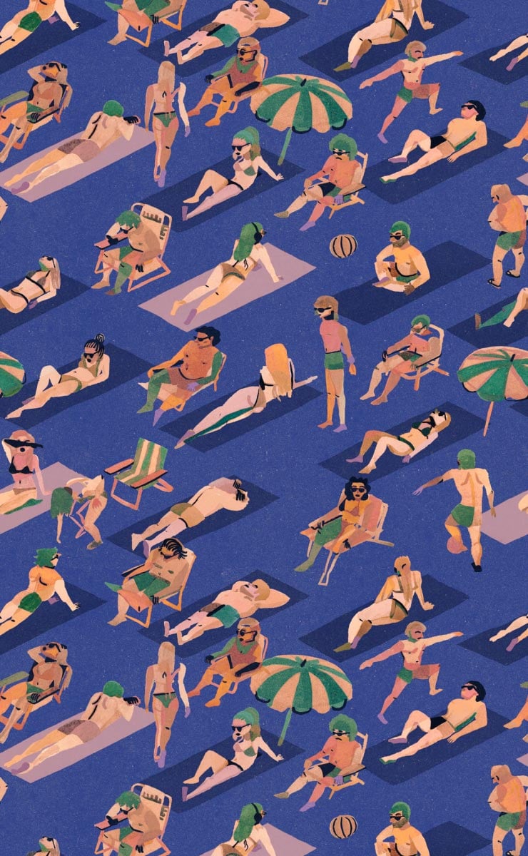 Sobre un fondo liso, personajes en bañador toman el sol, leen o charlan, tumbados en toallas o sentados bajo sombrillas. Este papel pintado Ipanema ilustra un rico motivo narrativo, en el que siluetas estilizadas vistas desde el cielo ocupan el espacio en una animada puesta en escena. Cada figura parece capturar un fragmento de vida suspendido, en una atmósfera de alegre relajación. La composición equilibra el ritmo de la decoración con una mirada casi cinematográfica. Tres Tintas Barcelona firma aquí un fresco vibrante y solar, propicio para la evasión.