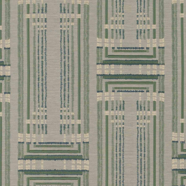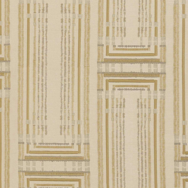 El revestimiento mural Montana presenta un motivo geométrico con formas rectangulares enmarcadas por líneas paralelas. La superficie de tejido jacquard está trabajada con bordados y apliques de terciopelo que aportan un contraste de texturas. Inspirada en la arquitectura modernista, esta decoración de Arte pone de relieve la precisión del diseño y el refinamiento textil.
