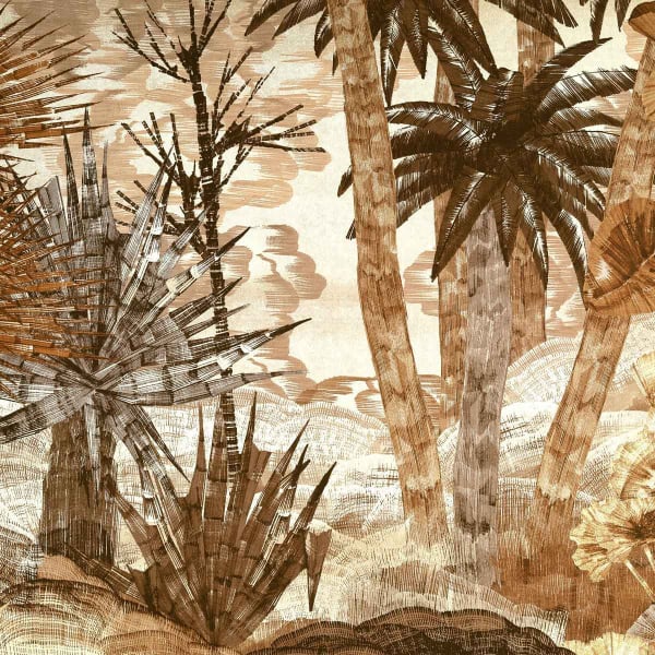 Yasuni es un papel pintado panorámico de Arte, inspirado en un territorio con una biodiversidad exuberante. Su estampado tropical estilizado revela una vegetación densa, salpicada de palmeras, amplios follajes y siluetas vegetales casi gráficas. Las líneas cortas y marcadas estructuran el conjunto. La impresión se realiza sobre una superficie textil de tacto aterciopelado, donde los tonos cálidos amplifican el efecto de relieve.
