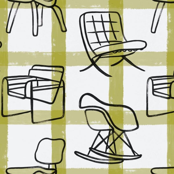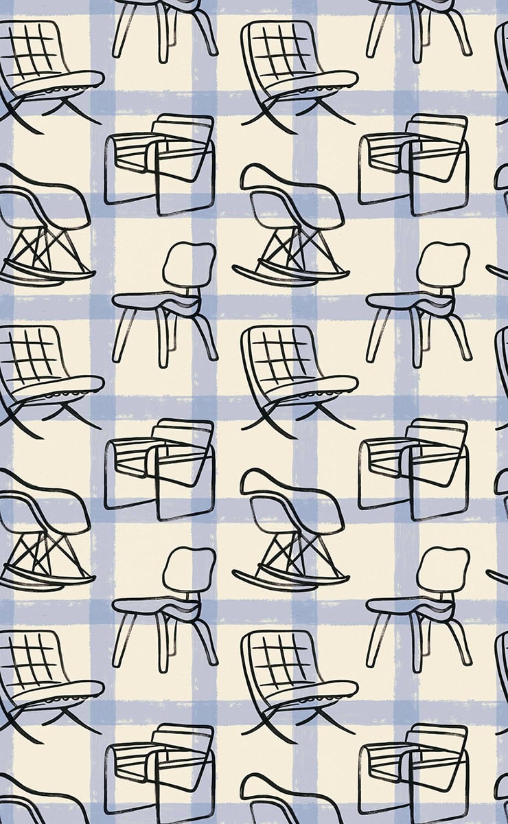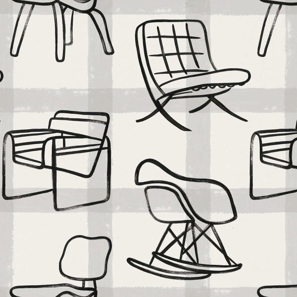 Las sillas icónicas del estilo moderno se despliegan sobre el papel pintado Iconicos. El motivo figurativo, de contornos limpios, se extiende sobre un fondo de cuadros irregulares. Las líneas sencillas y dinámicas componen los sillones clásicos. Coordonnée celebra el diseño en movimiento, en un lenguaje sobrio y expresivo.