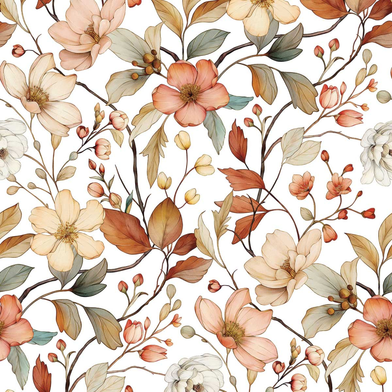 El papel pintado Louison revela un motivo floral de líneas fluidas. Grandes flores abiertas, con pétalos abiertos y ligeramente nervados, se mezclan con brotes y ramas frondosas. El diseño presenta contornos finos y un degradado sutil que evoca la acuarela. Esta decoración de Lilipinso compone un fresco vegetal, donde cada elemento sugiere un jardín en transición.
