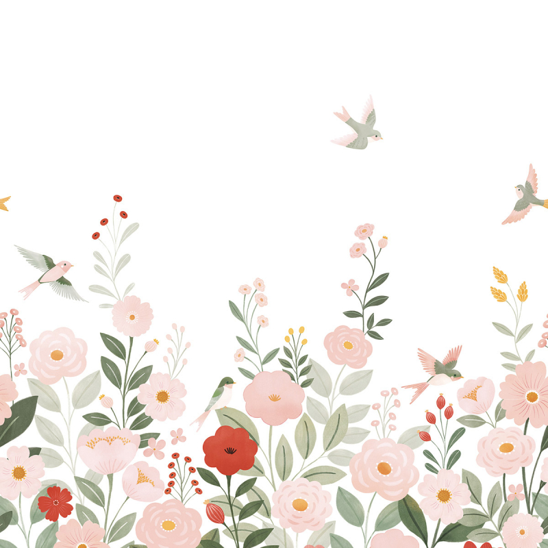 Con Alysse XL, Lilipinso transforma la pared en una decoración llena de suavidad. Este papel pintado panorámico presenta un paisaje estilizado, salpicado de flores de formas sencillas y follaje generoso. Los pequeños pájaros en vuelo aportan una sensación de movimiento y ligereza al conjunto. Este motivo floral sugiere un jardín tranquilo, donde cada elemento permanece congelado en un sutil equilibrio.