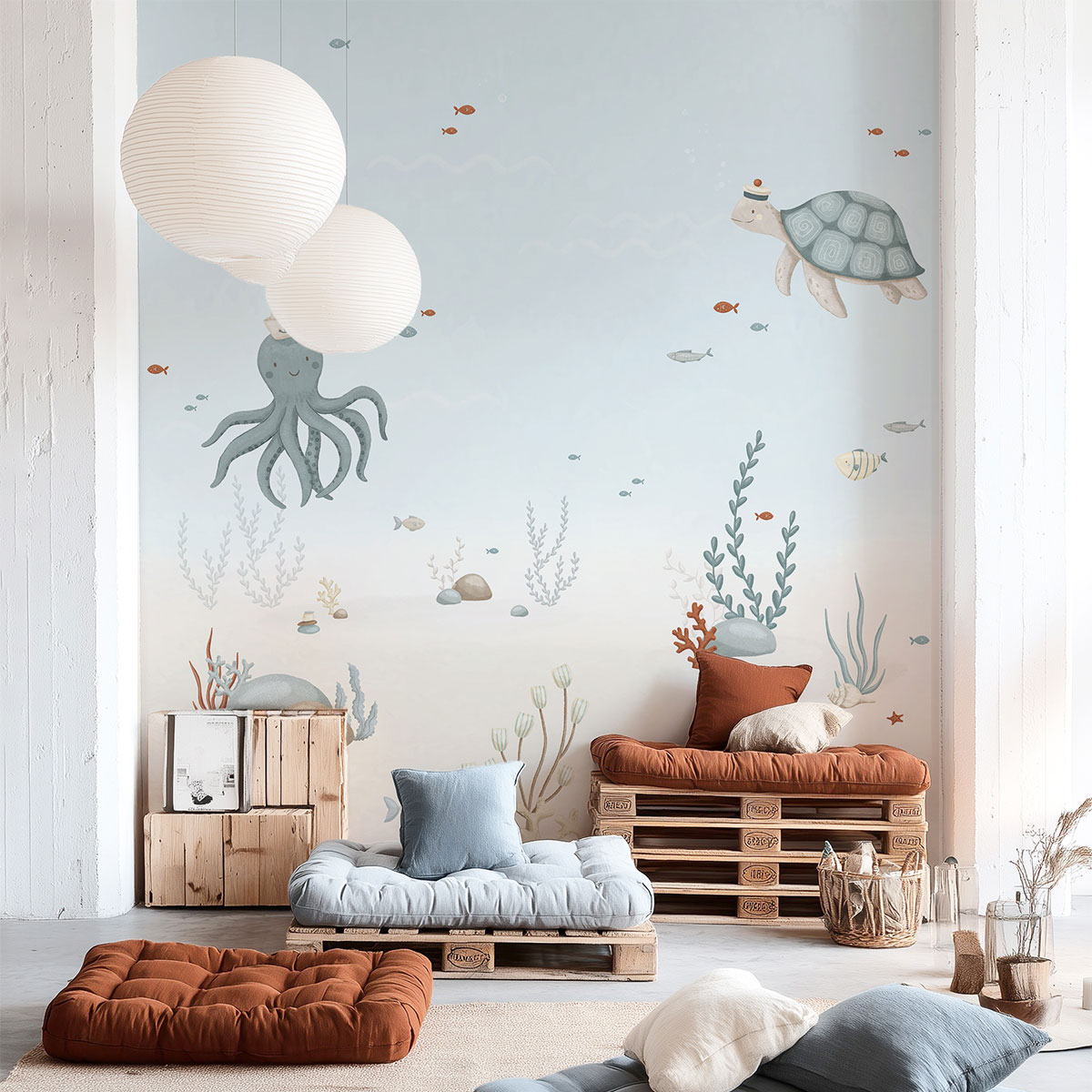 El papel pintado panorámico Lotan de Lilipinso representa un mundo submarino ilustrado con suavidad y fantasía. Un pulpo con peinado, una tortuga con sombrero y un banco de peces se deslizan entre algas finas y corales. El conjunto está bañado por una luz difusa que evoca las tranquilas profundidades del océano.