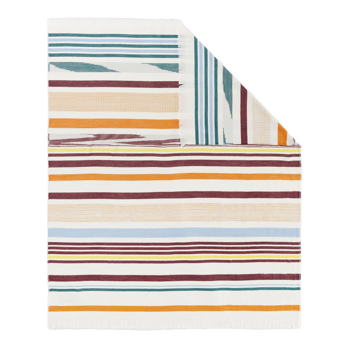 Biarritz es una manta a rayas compuesta por bandas irregulares y atrevidas. El diseño se estructura mediante la alternancia de líneas continuas, chevrones discretos y texturas gráficas. La lana natural, sinónimo de calidez y flexibilidad, crea un sutil contraste con la geometría de las formas. Unas finas franjas bordean el conjunto, con el espíritu refinado de Missoni Home.