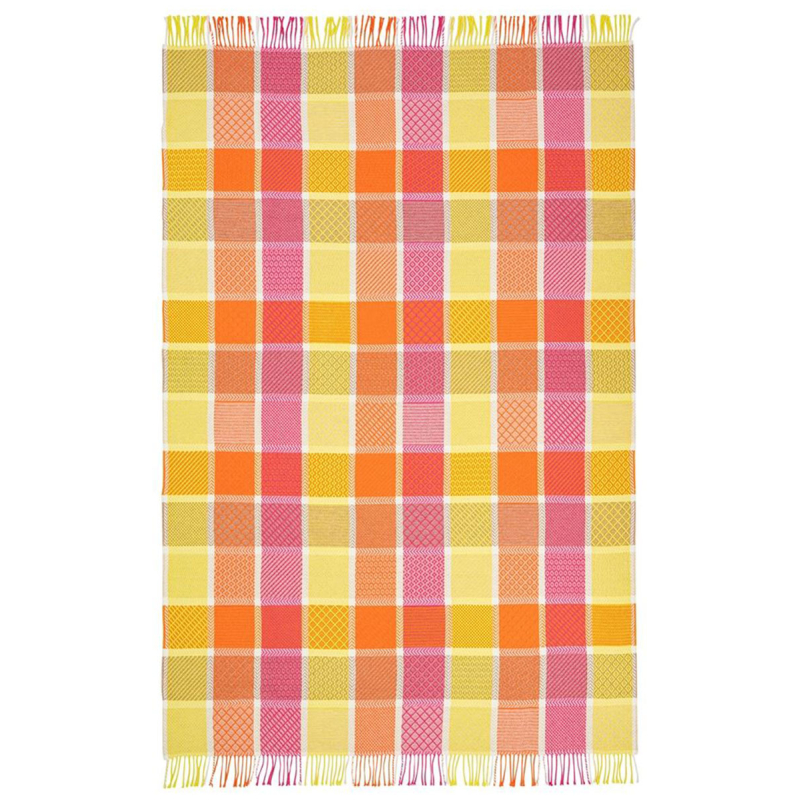 Una profusión de estructuras gráficas y texturas compone el estampado a cuadros de la manta Golbourne. Cada segmento, tejido en jacquard, alterna rombos, chevrones y cruces en una construcción precisa y rítmica. Los flecos prolongan esta dinámica con un acabado artesanal. Esta creación de Designers Guild, realizada en lana, afirma una riqueza visual impulsada por la diversidad del diseño.