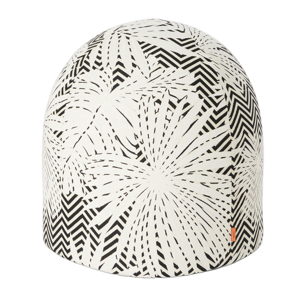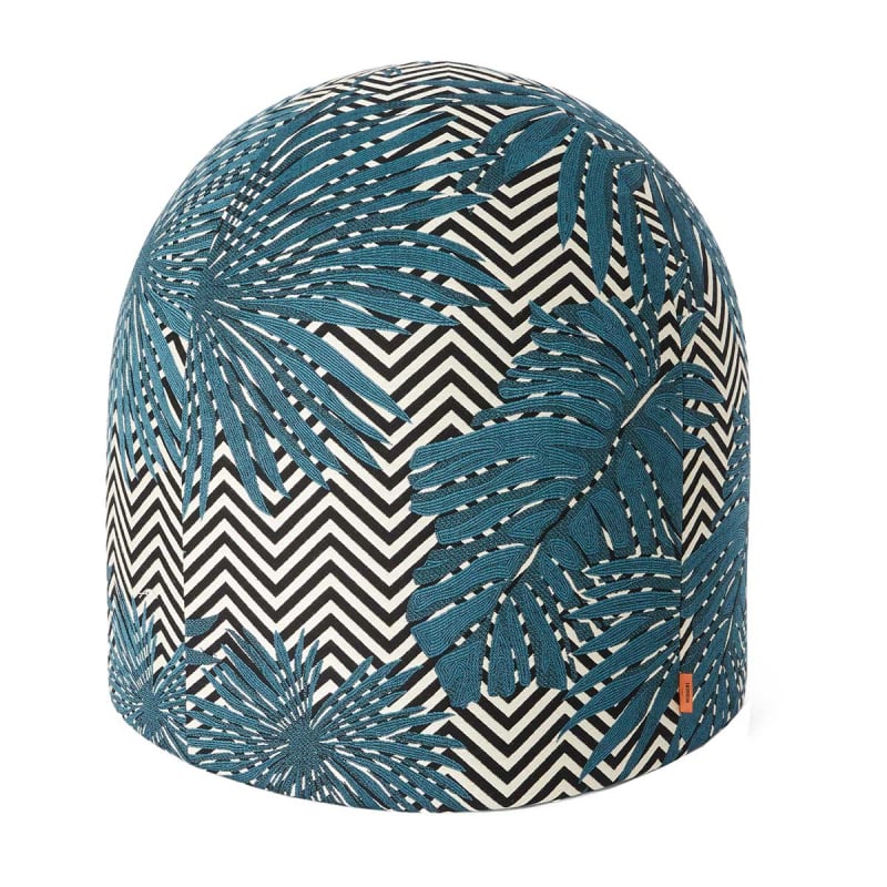 En el puf Ombre Panettone se encuentra un juego rítmico entre curvas abundantes y líneas en zigzag. El motivo geométrico y floral compuesto por bandas de hilo y figuras estrelladas crea una vibración en la superficie. El conjunto sugiere un estilo que oscila entre el arte óptico y el textil contemporáneo. La forma de panetón refuerza el impacto visual de esta decoración envolvente de Missoni Home.
