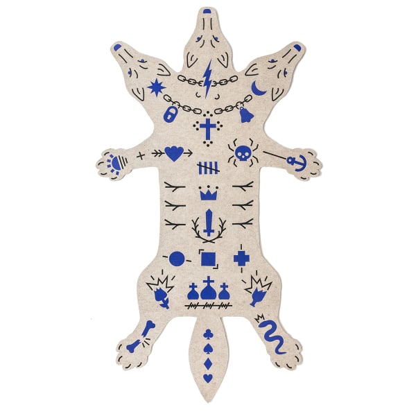 La alfombra Wolf adopta la impactante forma de un lobo de tres cabezas, congelado en una pose totémica. La silueta del animal se convierte en la base de un denso patrón gráfico, a medio camino entre el lenguaje tatuado y los símbolos místicos. Flechas, cadenas, rayos y corazones dibujan un mapa interior. Hecha de lana natural y elaborada por Budko, este diseño conserva la huella de la artesanía ancestral.