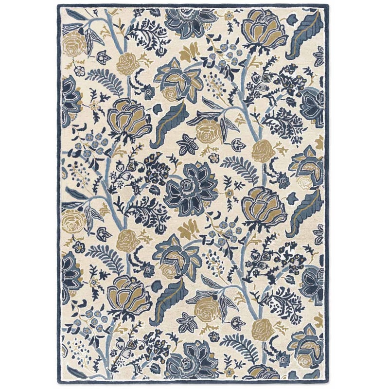 La alfombra Shalimar despliega un motivo floral estilizado inspirado en los jardines exuberantes. Las grandes corolas con contornos trabajados se mezclan con hojas finas, dibujadas con precisión sobre un fondo claro. Esta pieza de lana creada por Sanderson se distingue por su suavidad y riqueza gráfica. Tejida a mano, revela un trabajo de taller minucioso y una textura viva.