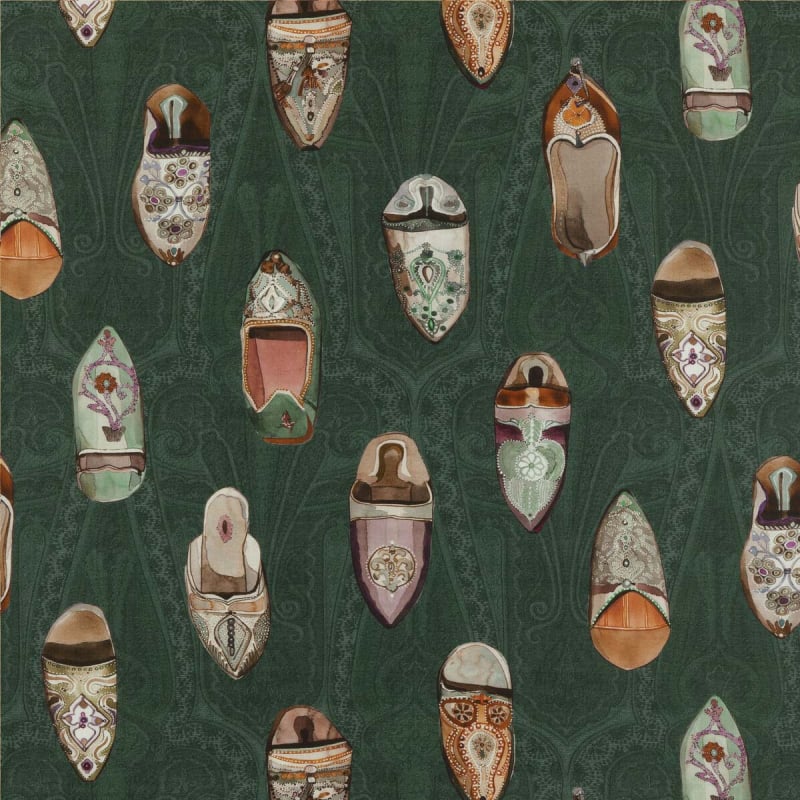 Mulberry ofrece un patrón impresionante a través del estampado de lino Babouches. Muestra unas zapatillas decoradas con varios detalles sobre un fondo bicolor. Este último se presenta en tonos cálidos que recuerdan los matices naturales de la tierra. Esta tela de estilo oriental y fantasioso ofrece un tacto suave.