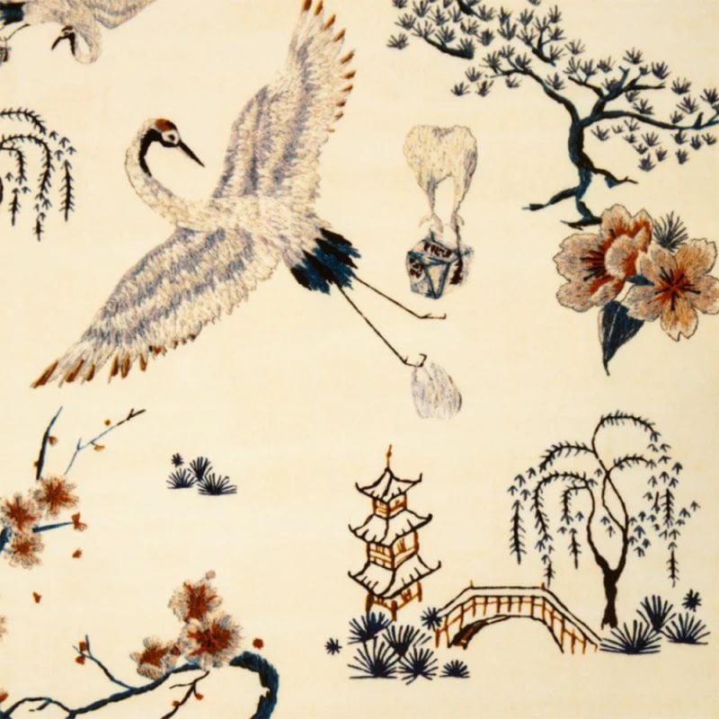 Poodle & Blonde Eco Food Babies Velvet evoca un encantador viaje primaveral. Las cigüeñas, en lugar de entregar bebés, traen paquetes de comida caliente a través de los árboles en plena floración. Este moderno patrón Chinoiserie está magníficamente impreso sobre suave terciopelo de algodón con una caída densa. En tonos cálidos y crema, inspira un ambiente acogedor y gourmet.
