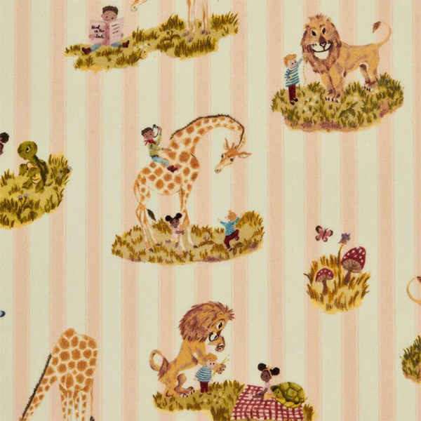 Pintado a mano, el diseño Eco Story Time Stripe encarna la inspiración para aprender, enseñar y contar historias. Tres personajes entrañables, el León, la Tortuga y la Jirafa, cobran vida bajo el talentoso pincel de la fundadora, Whinnie Williams. Con rayas en el fondo, este terciopelo de algodón ofrece una experiencia visual y táctil que evoca recuerdos de historias y momentos compartidos.