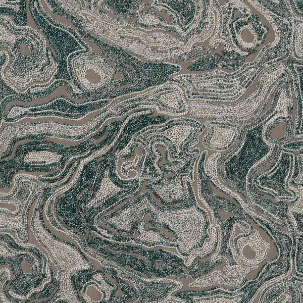 Benu Rumba Recycled es un tejido diseñado por Fischbacher. Las líneas entrelazadas dibujan formas en movimiento, similares a cortes de terreno o estratos minerales. El motivo está realizado en bordado denso, lo que confiere al tejido una textura en relieve táctil y expresiva. Cada sinuosidad parece resonar como una huella del tiempo, en una composición sin centro ni frontera.
