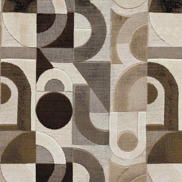En el terciopelo Greta Jour de Casal, el motivo juega con la repetición de las formas y la variación de los trazos. El diseño alterna círculos, arcos y espacios llenos entrelazados en una composición estructurada. El conjunto evoca un juego gráfico entre sombra y luz, volúmenes y planos. La superficie parece bordada en relieve, con texturas marcadas que subrayan los contrastes.