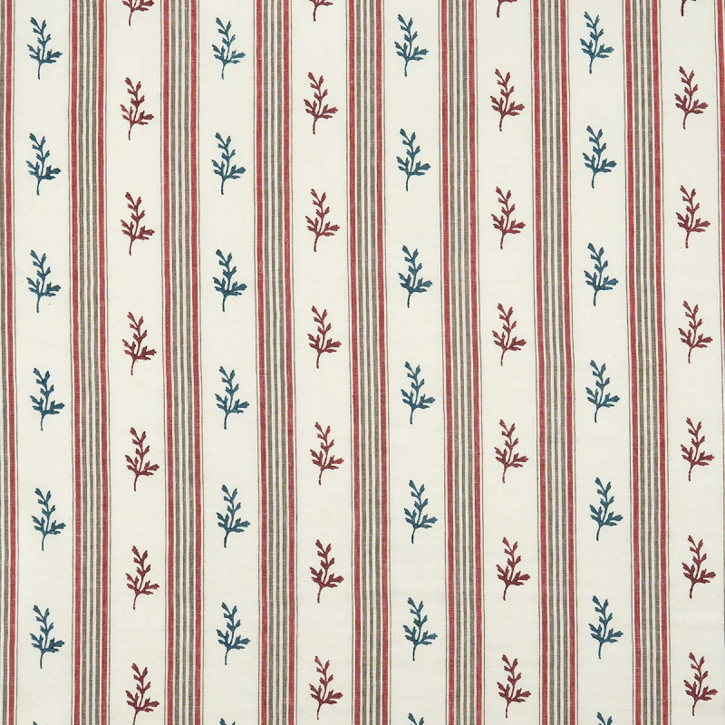 Anduze juega con el equilibrio entre el rigor gráfico y el encanto vegetal. El estampado floral estilizado se despliega en filas regulares enmarcadas por finas rayas verticales. La impresión a mano subraya el carácter artesanal del diseño con contornos delicados. Confeccionado en lino, este tejido de Nina Campbell revela una trama tan cadenciosa como aérea.